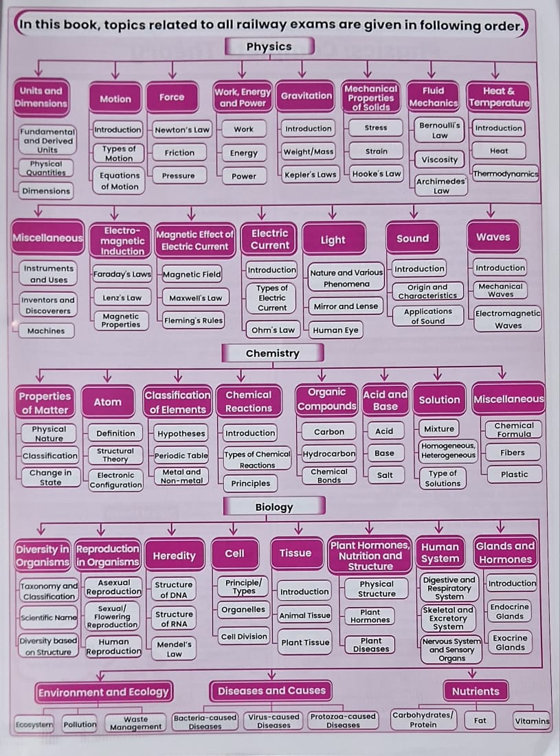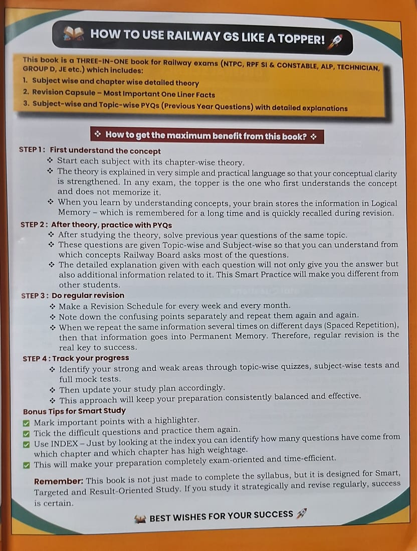 It covers all major subjects — Physics, Chemistry, Biology, History, Indian Polity, Geography, Indian Economy, Static GK, and Computer Awareness — following the latest Railway and SSC exam patterns. The book ensures conceptual clarity and provides quick revision tools for effective preparation.