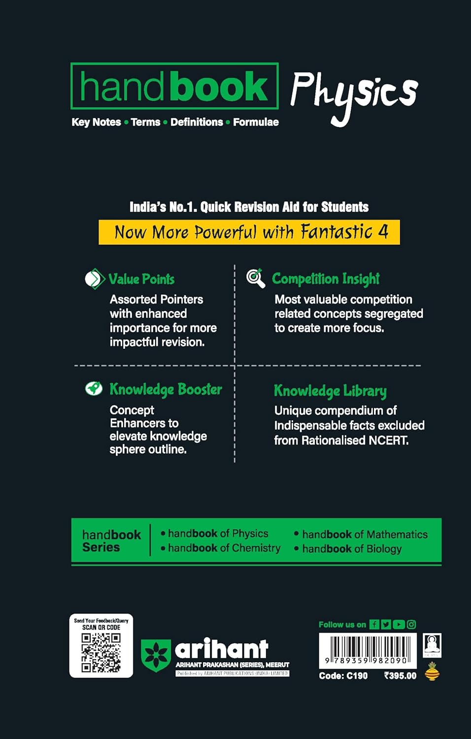 A compact and comprehensive handbook that covers all important Physics concepts, formulas, definitions, and principles in a clear and systematic manner. Specially designed for IIT-JEE, NEET, Class 11th & 12th Boards, and other competitive examinations, this book helps students with quick revision, concept clarity, and problem-solving. Its concise format makes it an ideal reference for last-minute preparation and effective learning.