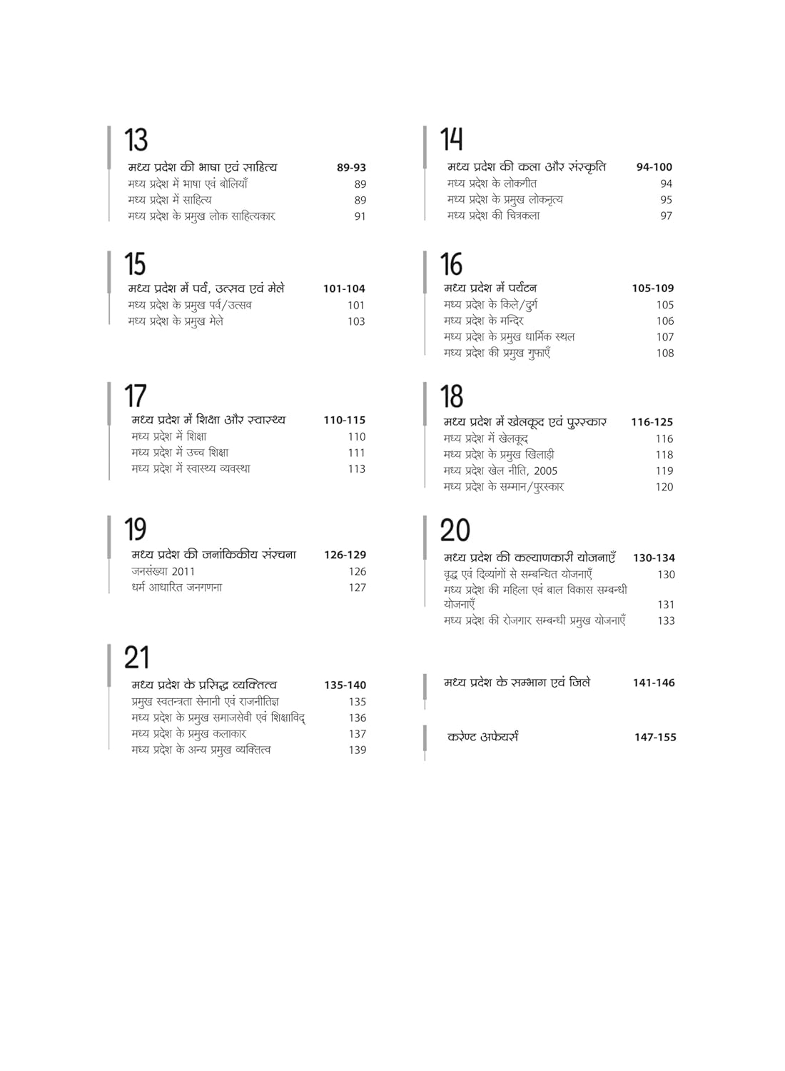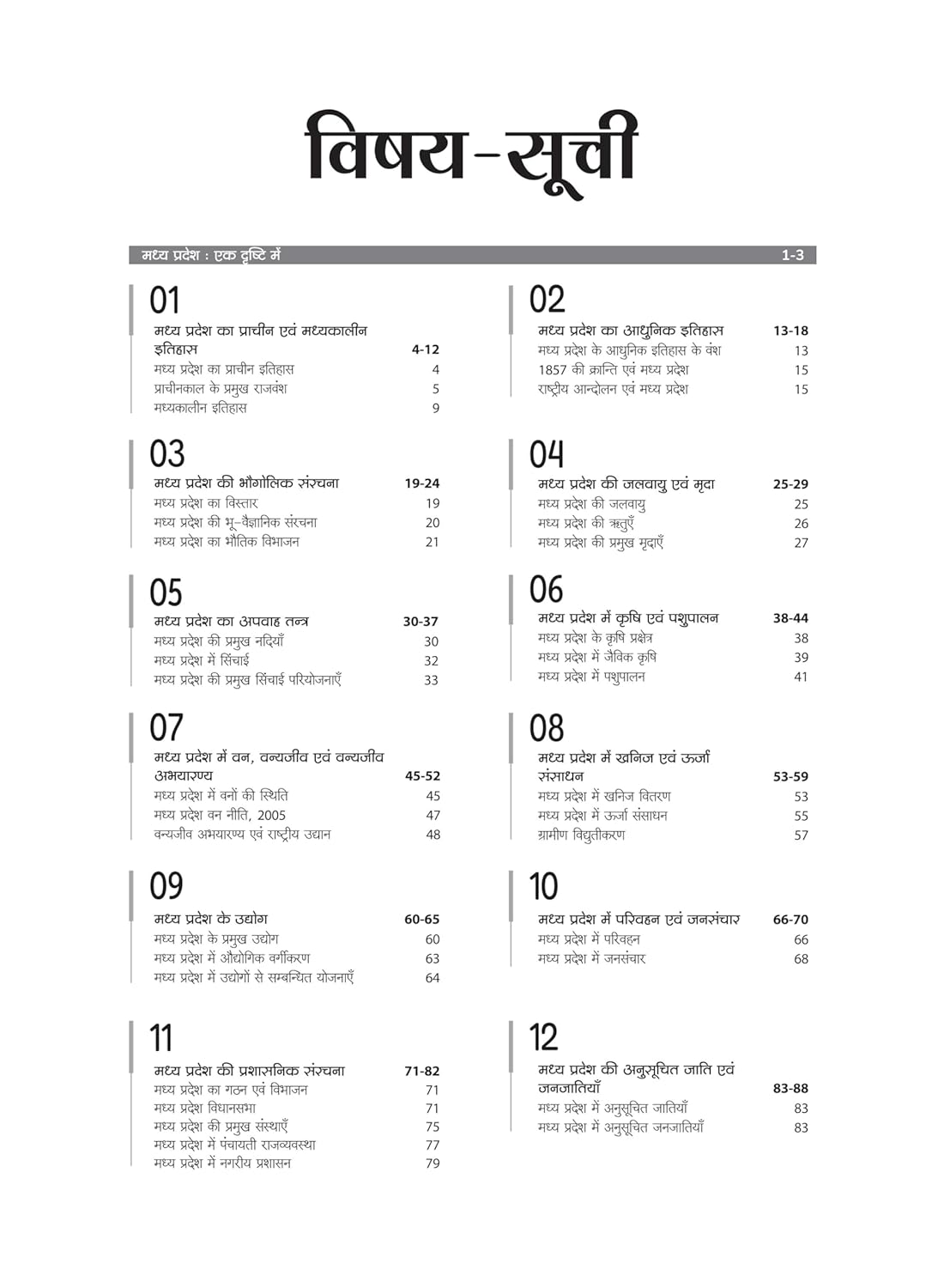 Ye book specifically Madhya Pradesh ke state-level competitive exams (jaise Madhya Pradesh Public Service Commission [MPPSC], Madhya Pradesh Professional Examination Board (MPSSE), Madhya Pradesh Police etc.) ke liye design ki gayi hai. Book chapter-wise factual questions present karti hai jo Madhya Pradesh ki history, geography, polity, economy, culture - aur latest state current affairs ko cover karti hai. Ye book Hindi medium mein hai aur state-specific GK ko concise & focused tareeke se revise karne mein aspirants ke liye bahut useful hai. For example, ek version “4000+ Chapterwise Coverage …” bhi listed hai jo 4000+ questions provide karta hai.