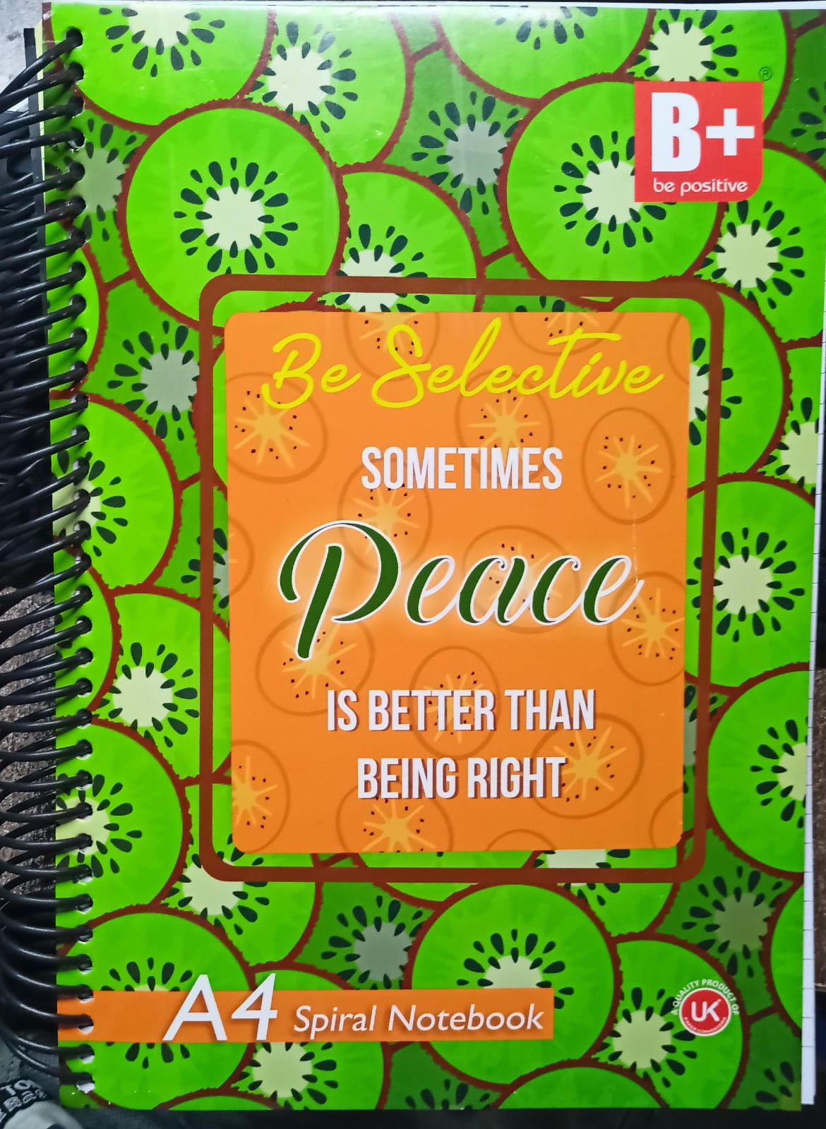 B+ Be Positive A4 Spiral Notebook ek stylish aur durable spiral-bound notebook hai jisme motivational quote likha hai — “Be Selective, Sometimes Peace Is Better Than Being Right.” Iska vibrant kiwi-themed cover design aur high-quality smooth pages likhne ka anubhav aur bhi enjoyable bana dete hain. Yeh notebook school, college, aur office ke daily writing, note-making aur journaling ke liye perfect hai.