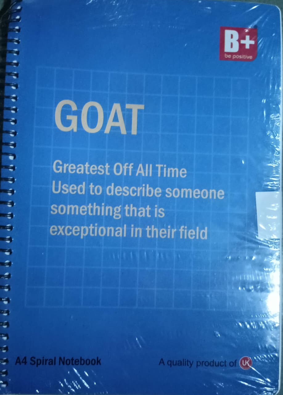 The B+ GOAT A4 Spiral Notebook is a motivational and premium-quality notebook designed for achievers. Featuring the inspiring text “GOAT – Greatest Of All Time”, it celebrates excellence and positivity. The durable spiral binding and smooth A4-sized pages make it ideal for writing, journaling, note-taking, and creative work. Perfect for students, professionals, or anyone striving to be the best in their field.