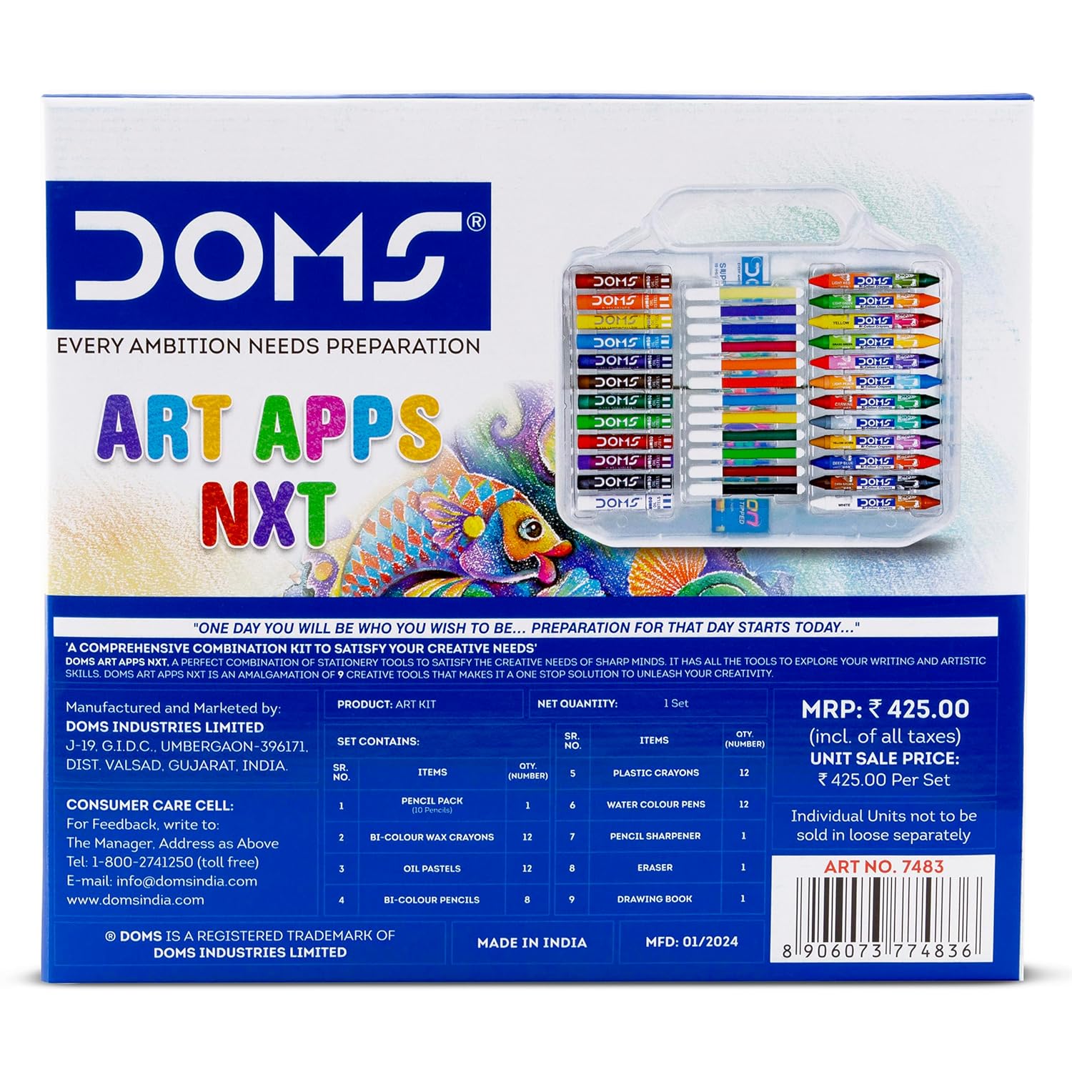 Doms Art Apps Nxt Kit is a complete creative stationery set, packed in a durable plastic carry case for easy portability. This kit contains 9 essential art items including watercolour pens, crayons, oil pastels, colour pencils, eraser, sharpener, and more – making it perfect for kids, students, and beginners. Ideal for drawing, sketching, colouring, and gifting purposes, it offers both fun and learning in one compact set.