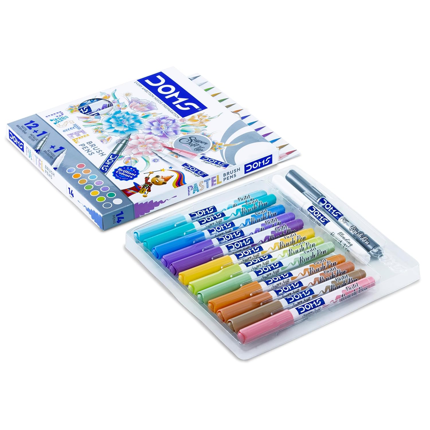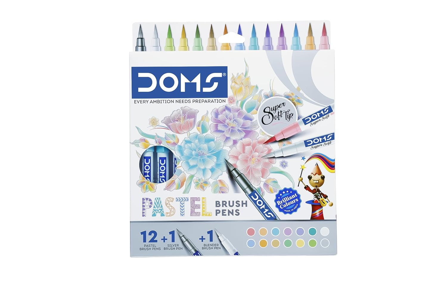 Doms Super Soft Tip Brush Pen Set – Pastel Shades (12 Pastel + 1 Silver + 1 Blender)