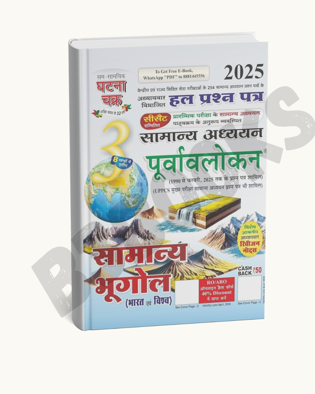 A complete book on General Geography in Hindi Medium by Ghatna Chakra. Includes physical, economic, and human geography with detailed explanations, maps, and objective questions. Based on the latest exam pattern, highly useful for UPSC, State PCS, SSC, Railway, and other competitive exams.