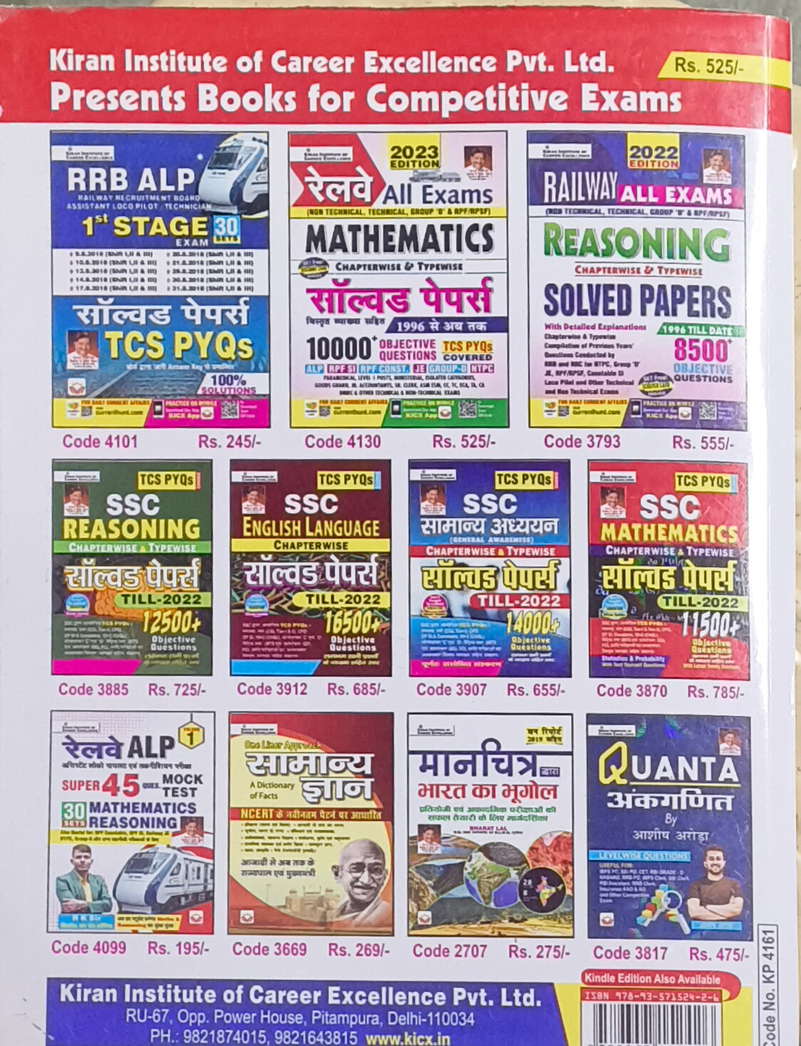 A must-have book for Railway aspirants, this Hindi-medium edition by Kiran Publications compiles all previous years’ reasoning questions from various Railway exams like Group D, NTPC, ALP, and others. Organized chapterwise with detailed solutions, it is ideal for thorough concept building and practice. Covers Analogy, Series, Coding-Decoding, Puzzles, and more.