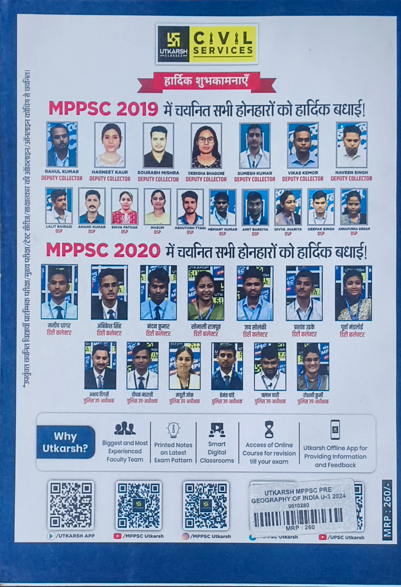 A focused book for MPPSC Prelims covering Unit 3 of the syllabus: the geography of India. It includes detailed explanations on landforms, drainage systems, soil and vegetation types, climate patterns, and natural resources. This English-medium resource is enriched with maps, current data, and practice questions tailored to MPPSC standards, making it ideal for aspirants targeting a strong grip on India’s geographical framework.