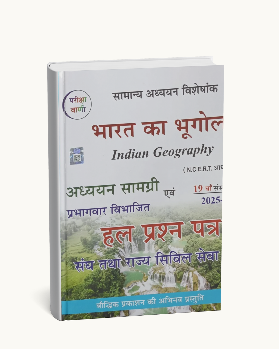 This book Pariksha Vani Bharat Ka Bhugol by S.K. Ojha is a comprehensive Hindi-medium guide for students preparing for competitive exams like UPSC, State PCS, SSC, and other government tests. It covers the complete Indian Geography syllabus, includes chapterwise MCQs, and provides solved question papers from the last 32 years. The book is designed for easy understanding and effective exam preparation.