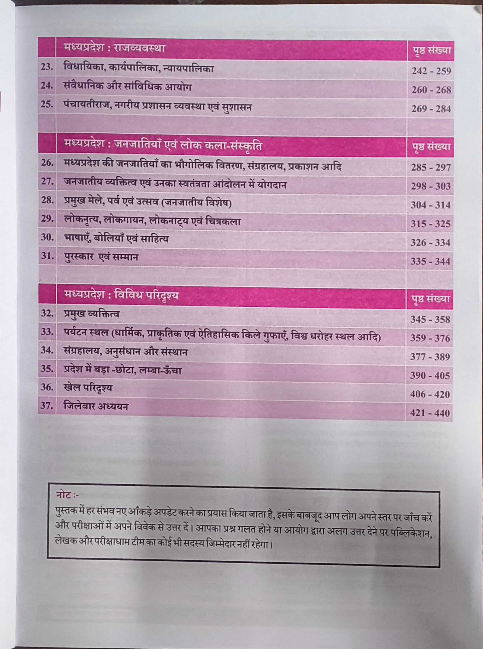 A dedicated objective-type question bank focused on Madhya Pradesh General Knowledge (MP Samanya Adhyayan), covering the MPPSC Prelims and other state exams. The book contains numerous MCQs organized by syllabus topics with detailed explanations.