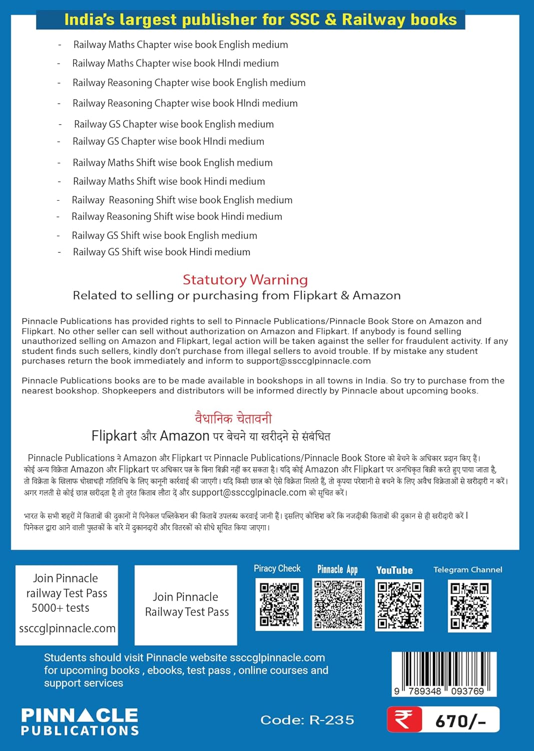 Excel in the Railway exams with Pinnacle Publication Railway Science Adhyayan 2nd Edition. This updated edition provides complete coverage of Physics, Chemistry, Biology, and Everyday Science based on the latest RRB syllabus. The book includes detailed theory, chapterwise important facts, solved previous year questions, and practice sets designed to improve conceptual understanding and exam readiness. Ideal for RRB NTPC, Group D, ALP, JE, and other Railway recruitment exams, this guide is a must-have for mastering General Science in Hindi.