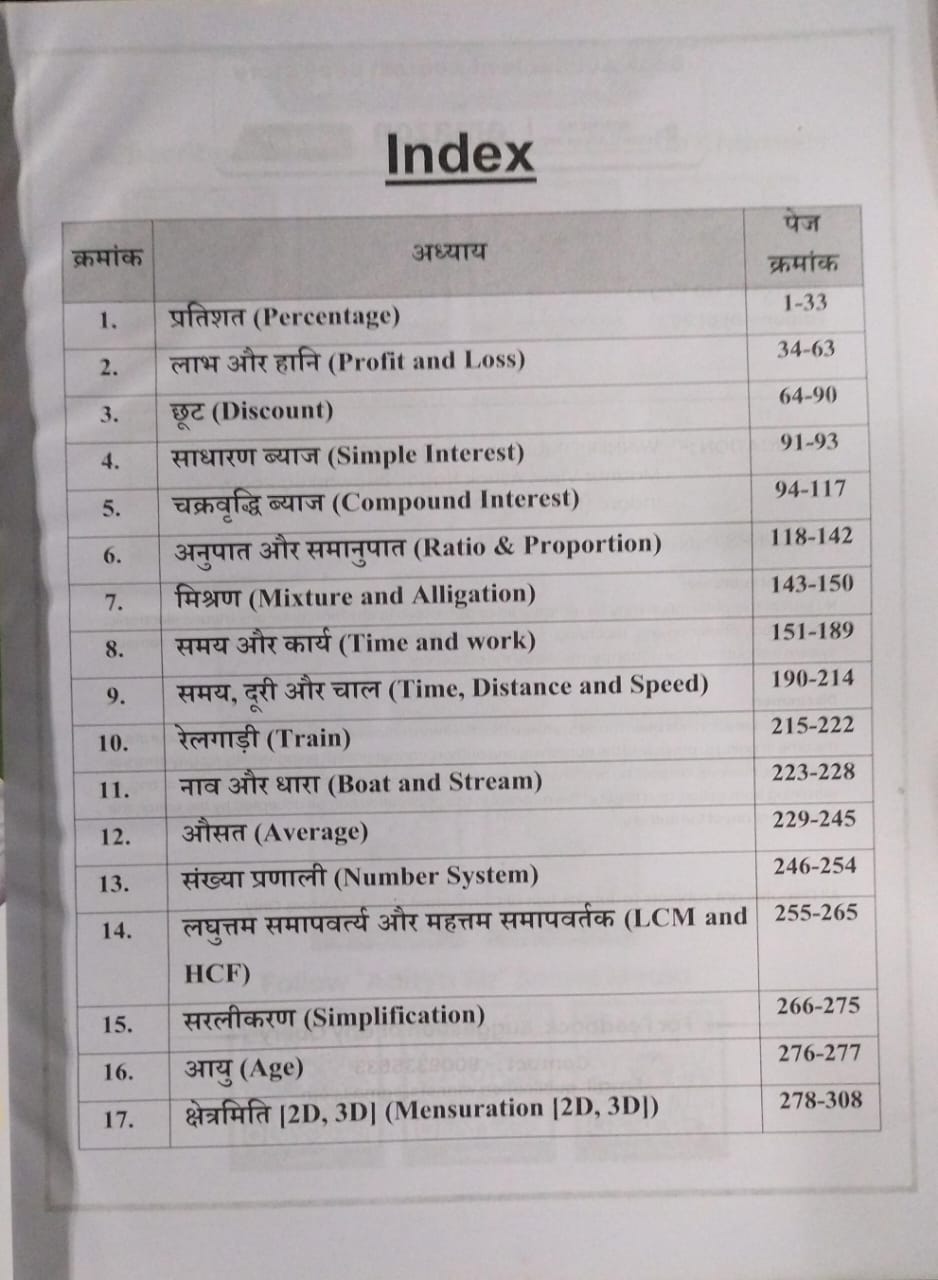 This book covers all major topics of Quantitative Aptitude, including Number System, Percentage, Profit & Loss, Simple and Compound Interest, Time and Work, Average, Ratio and Proportion, Geometry, Mensuration, Algebra, Trigonometry, and Statistics.